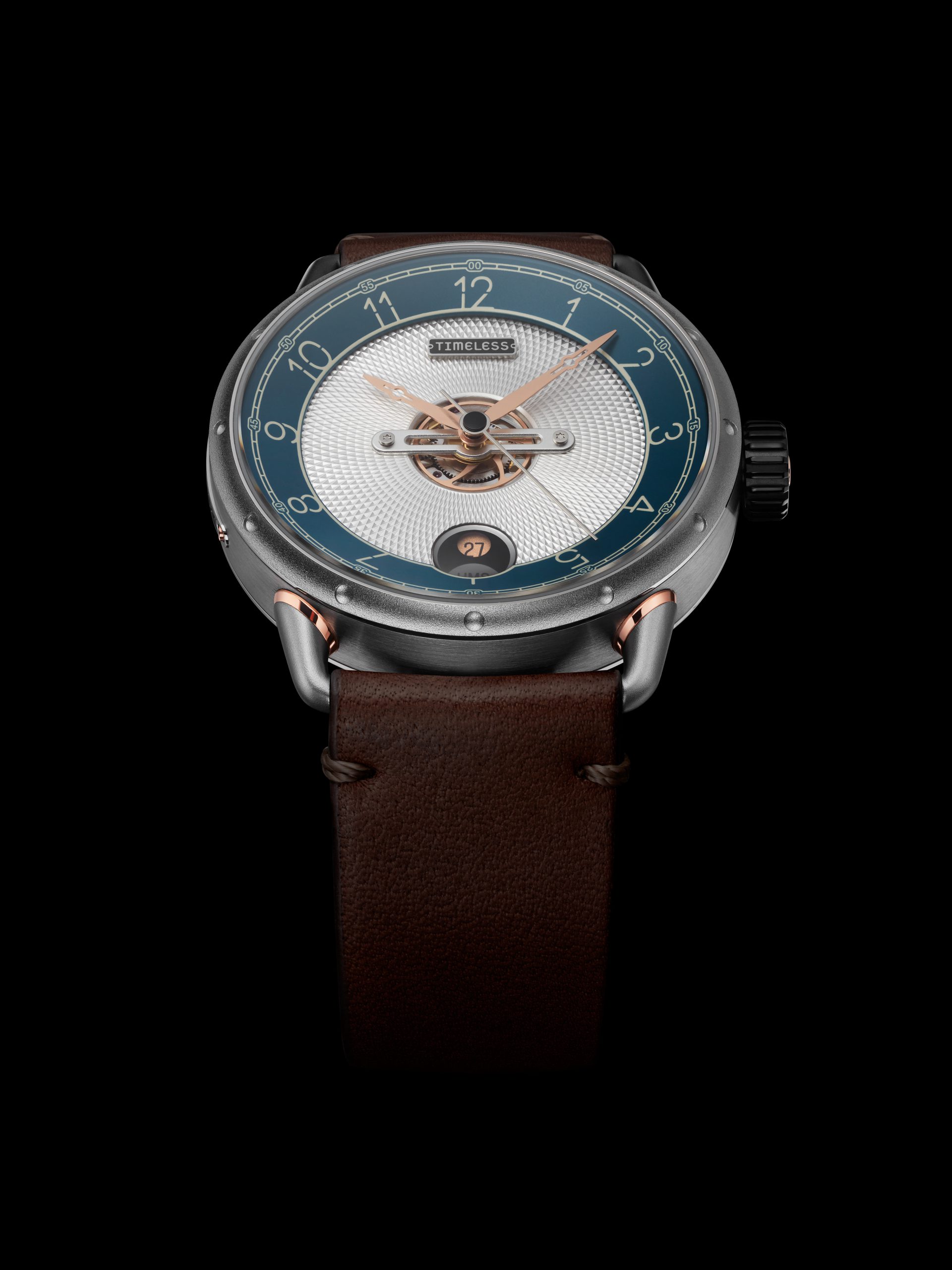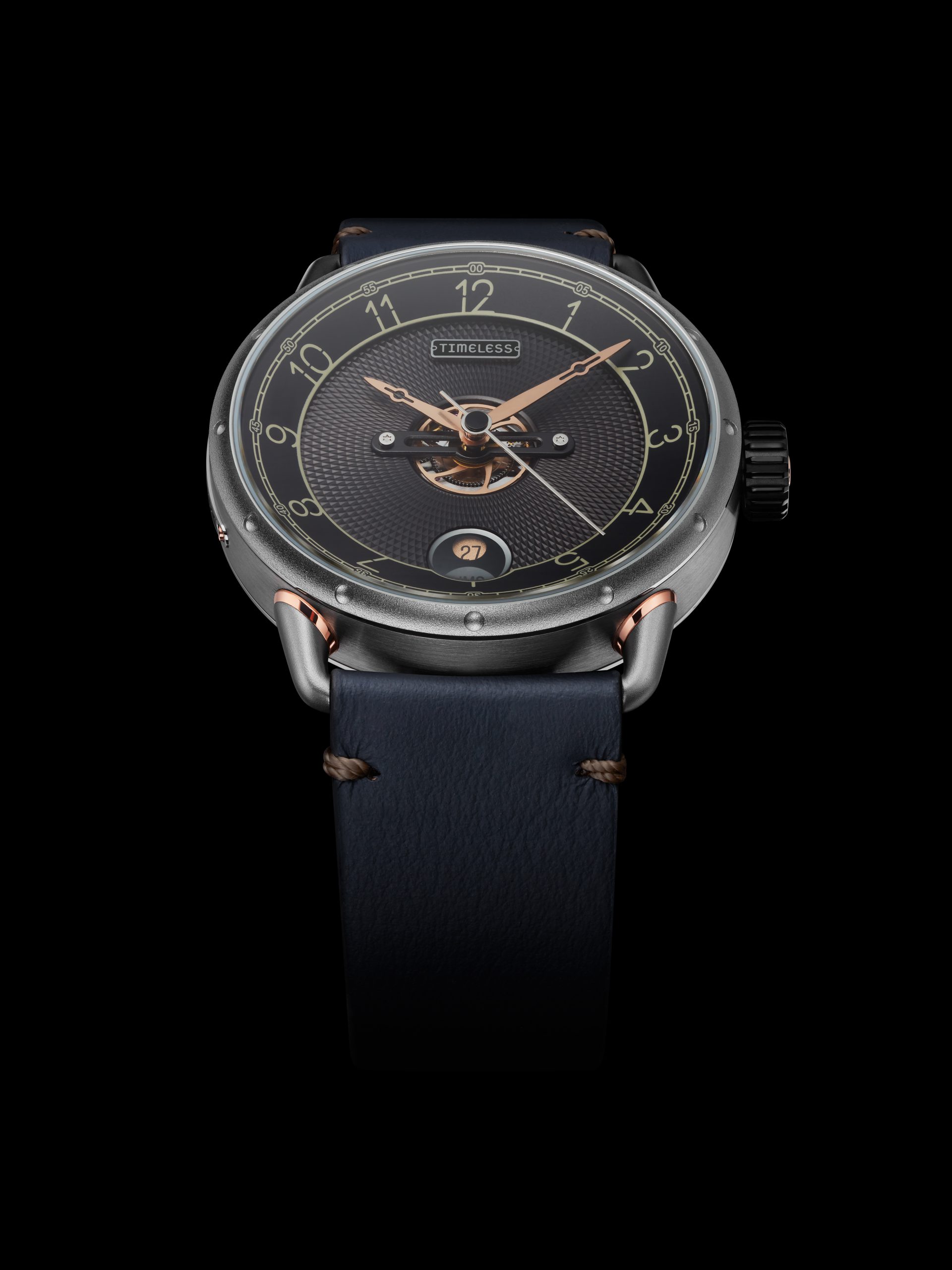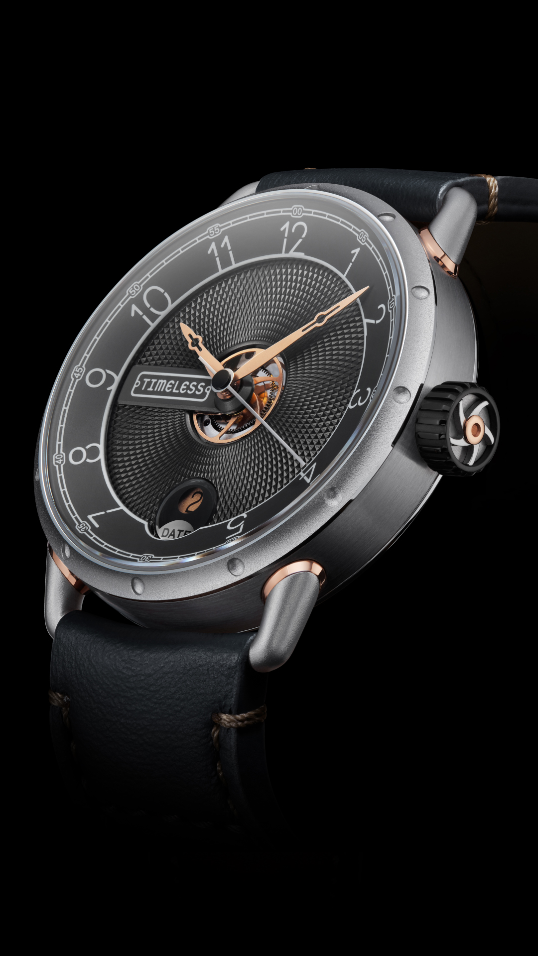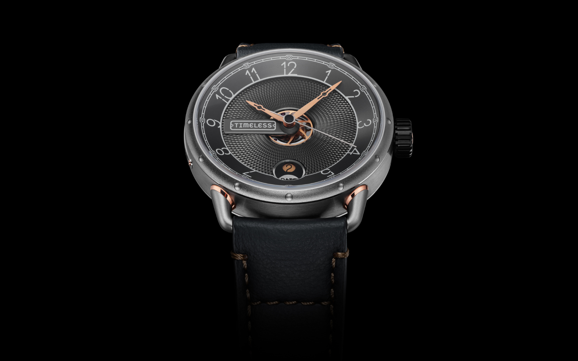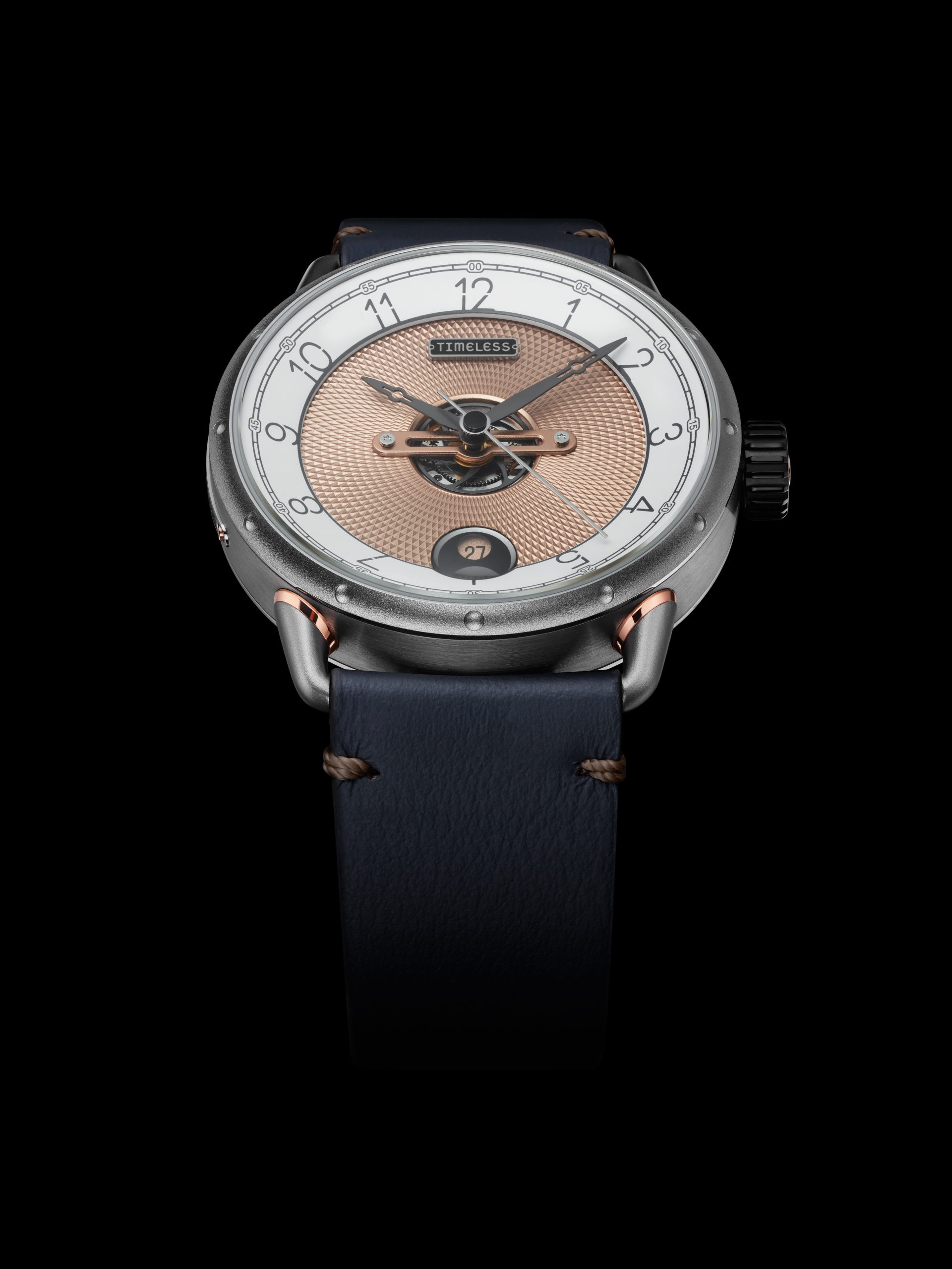 Premier modèle de la marque Timeless, ce garde-temps en acier orné de fins détails plaqués en or rose et d’un verre saphir bombé sied à tous.