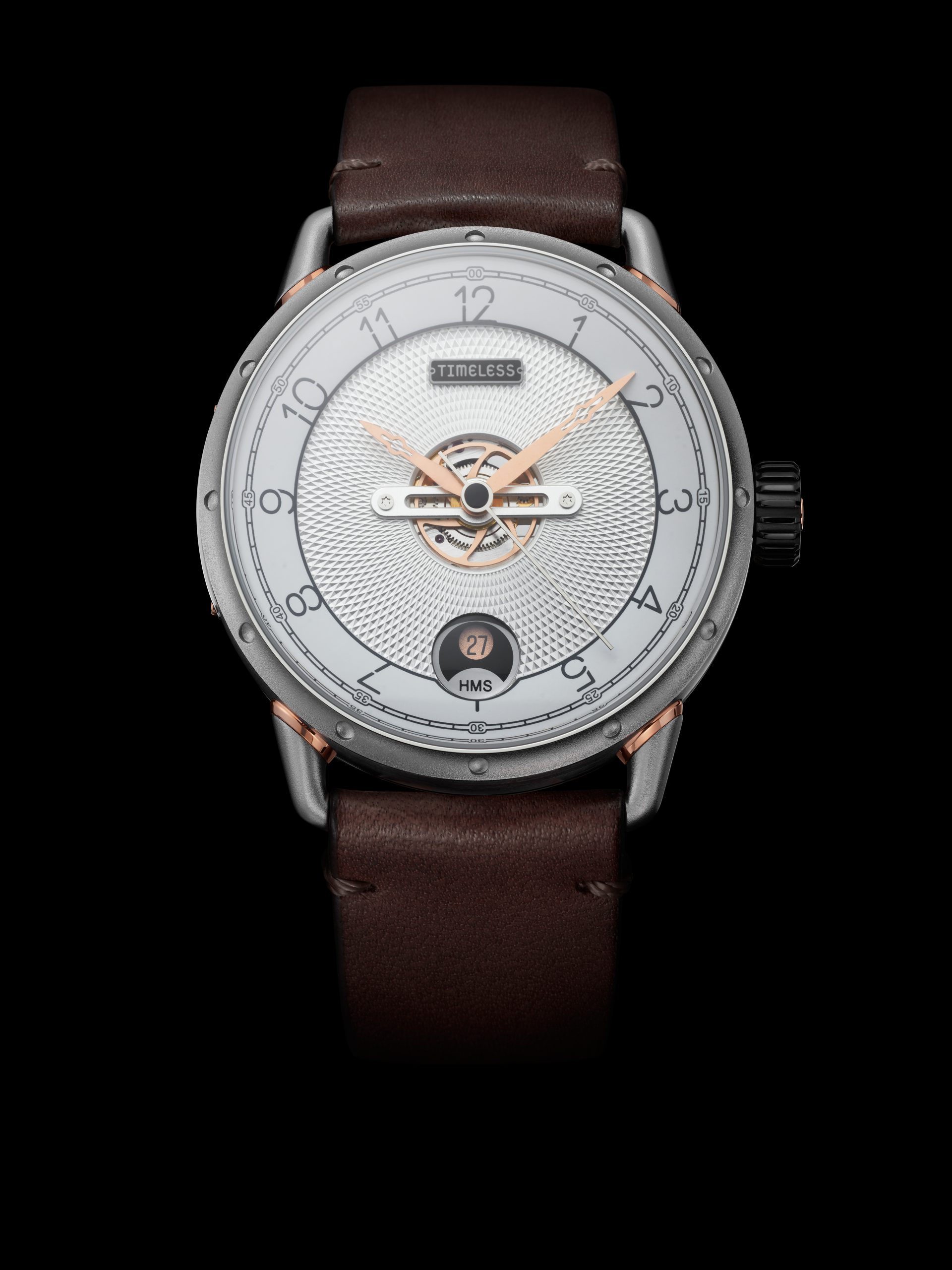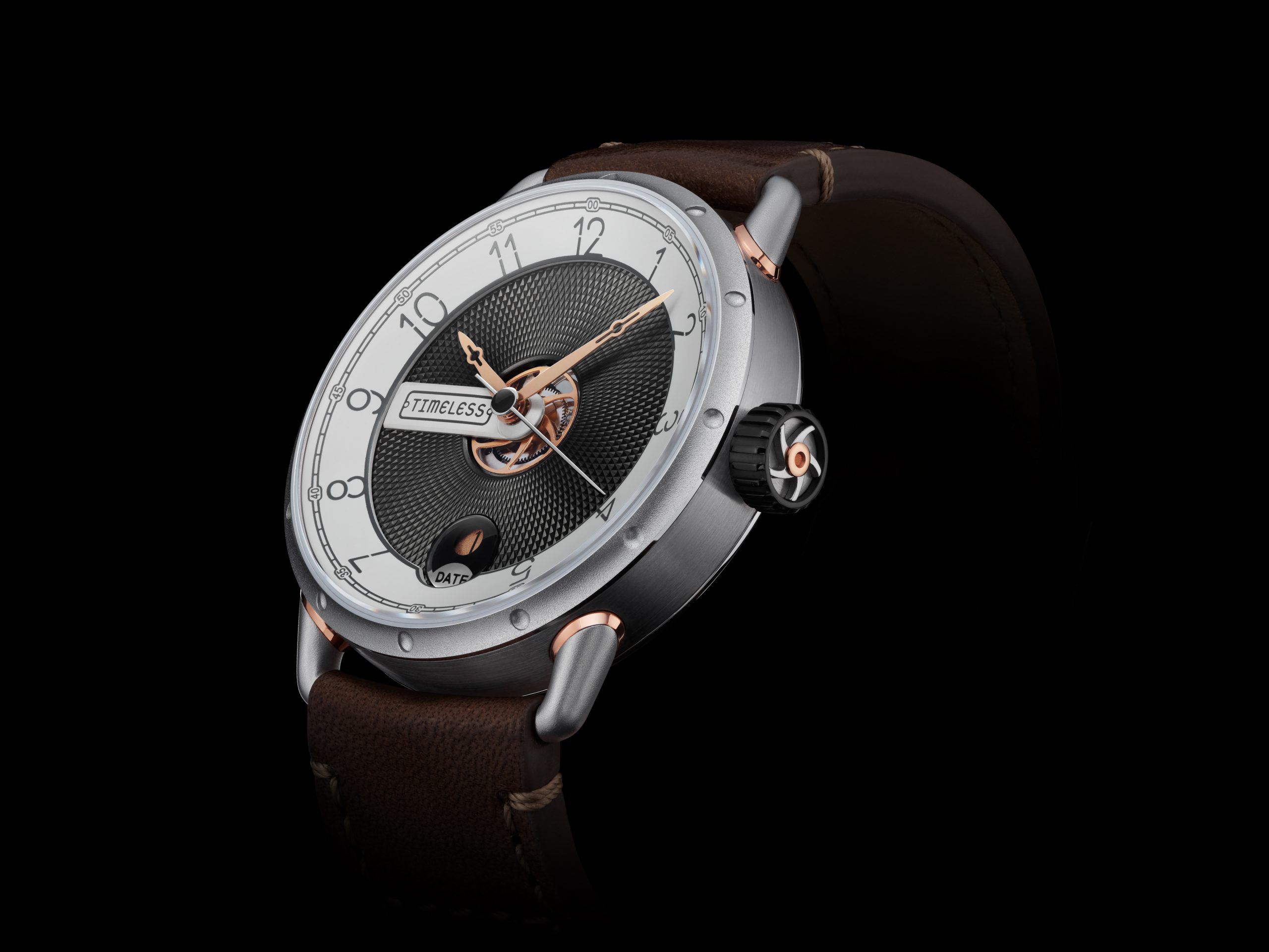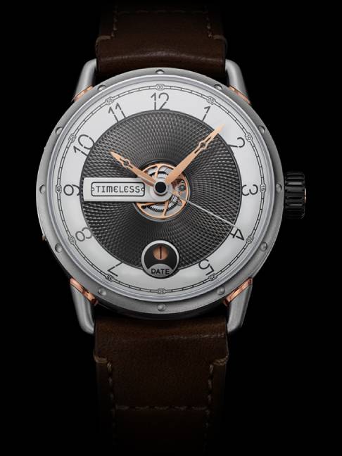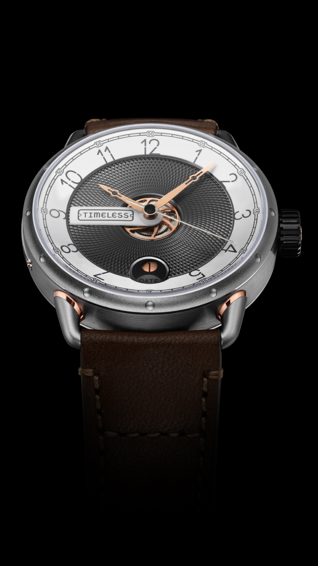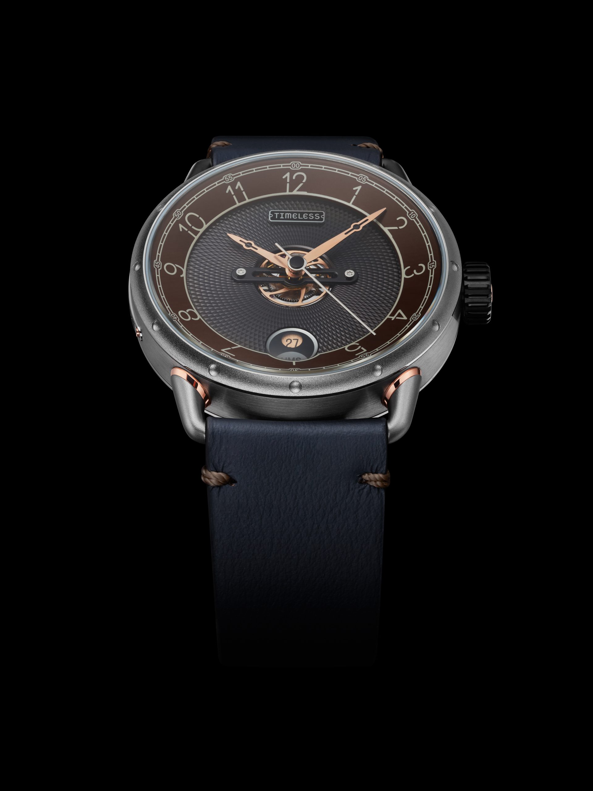 Premier modèle de la marque Timeless, ce garde-temps en acier orné de fins détails plaqués en or rose et d’un verre saphir bombé sied à tous.