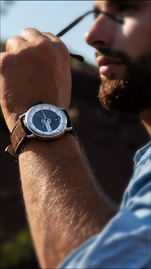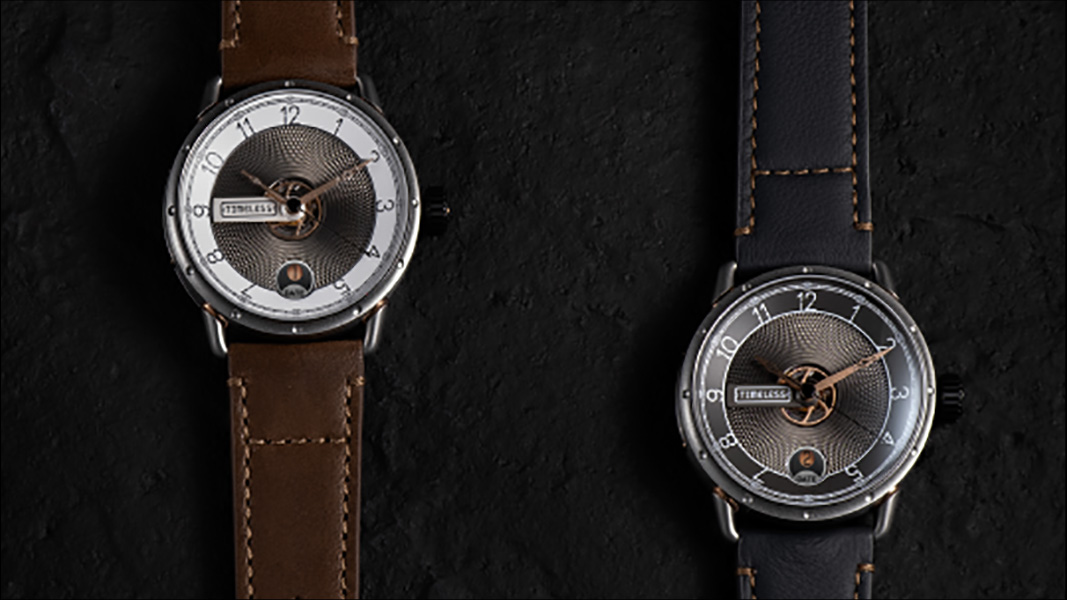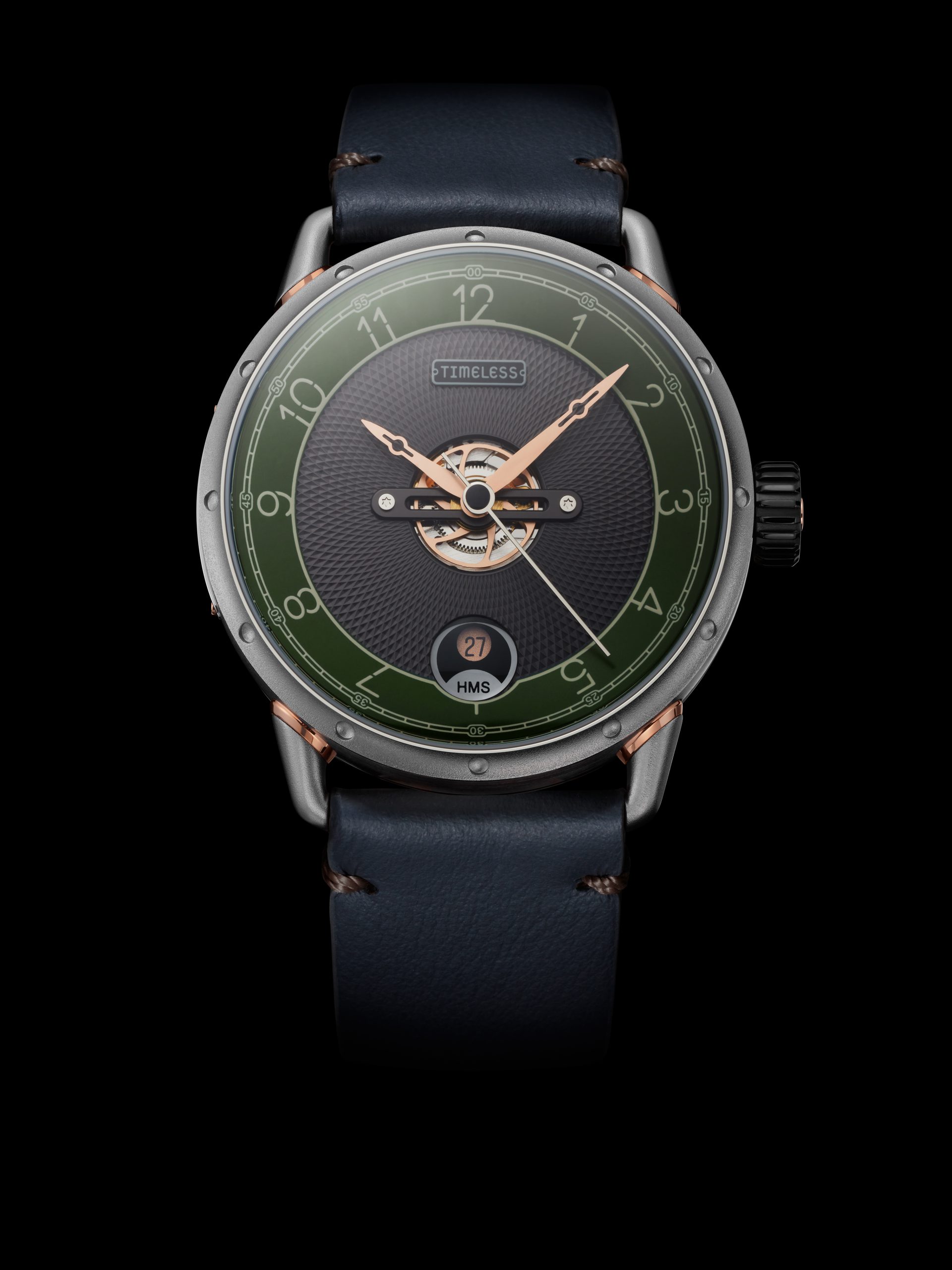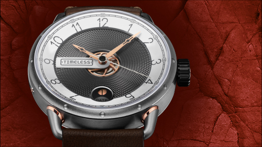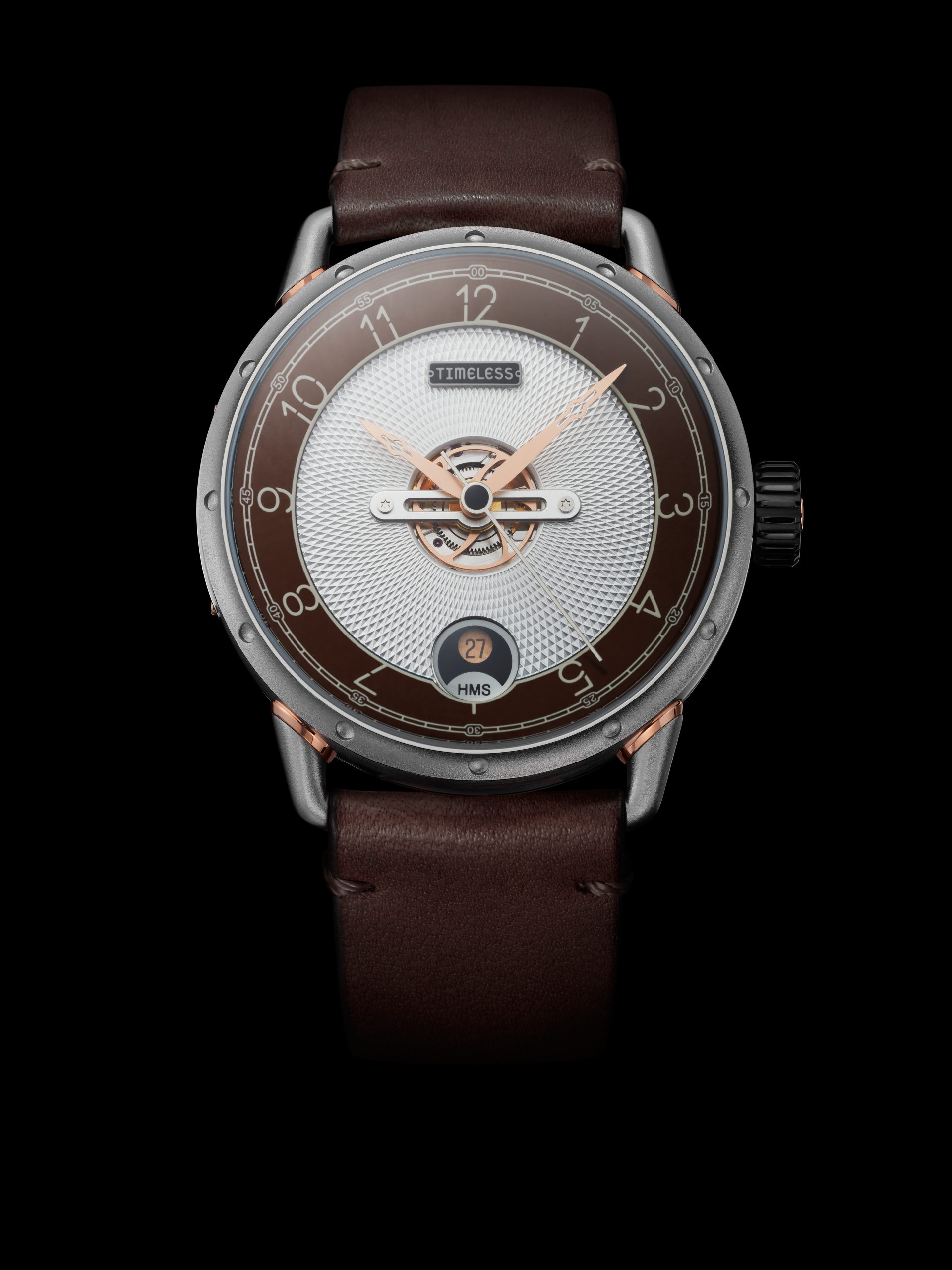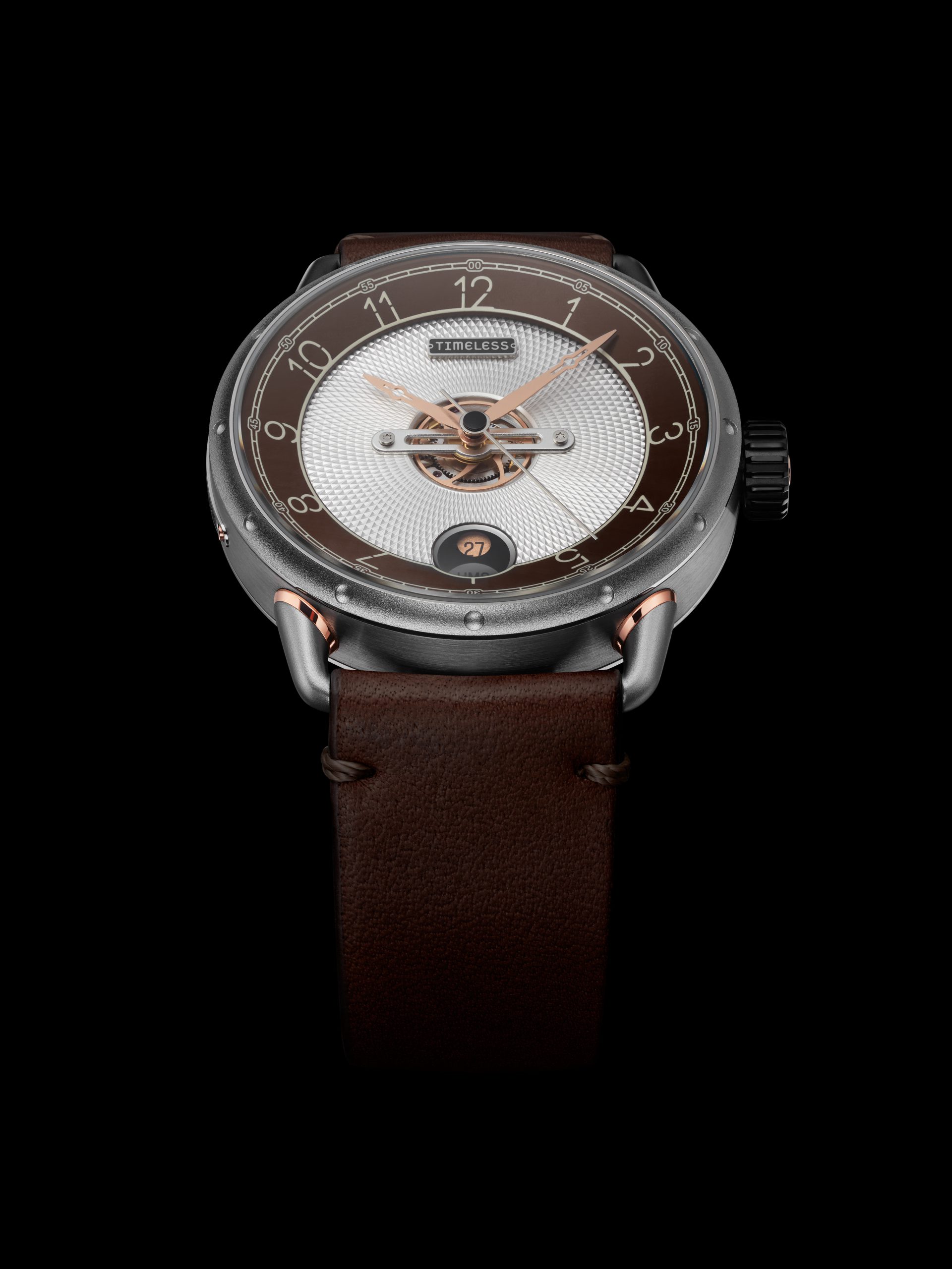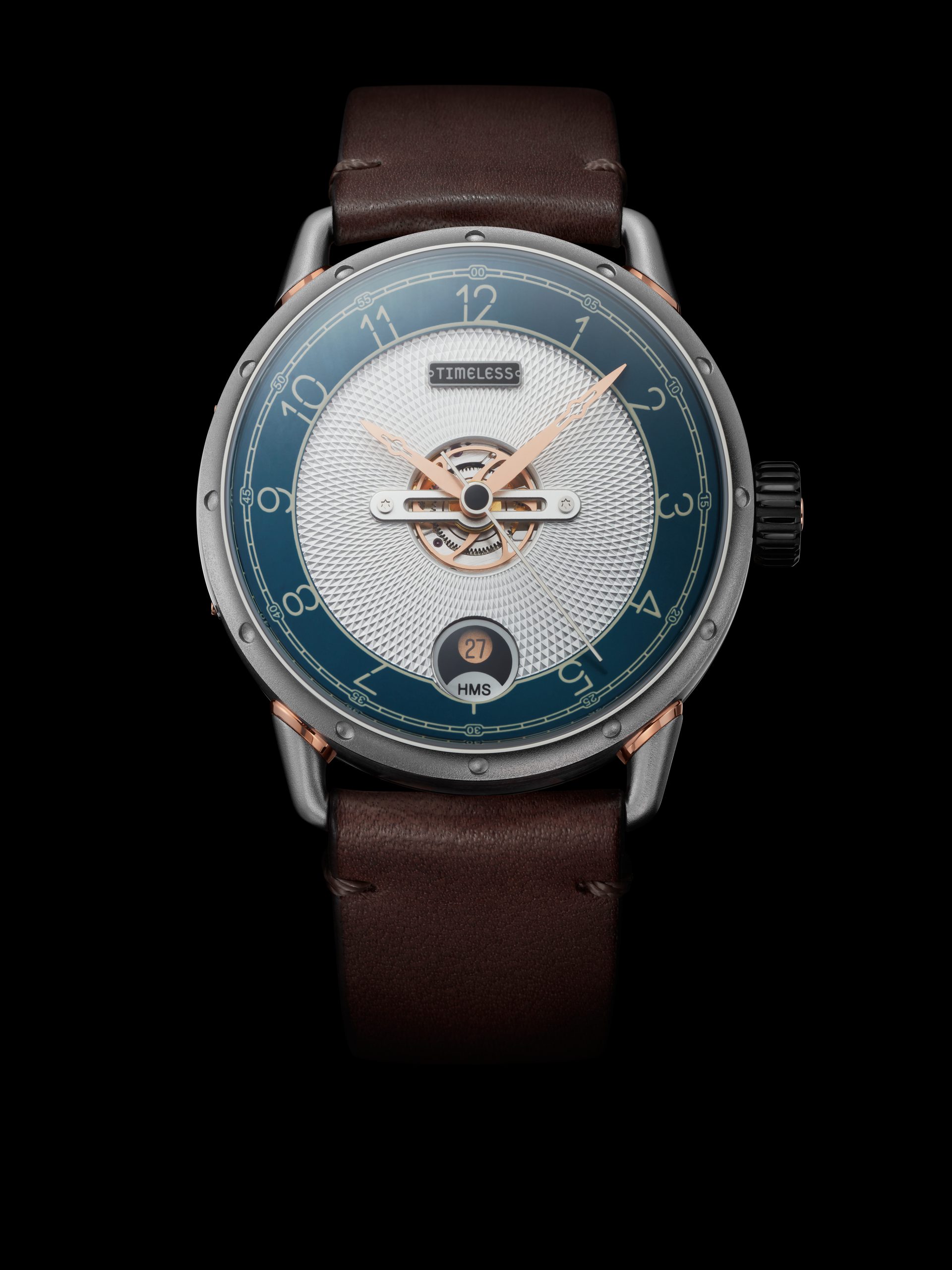 Premier modèle de la marque Timeless, ce garde-temps en acier orné de fins détails plaqués en or rose et d’un verre saphir bombé sied à tous.