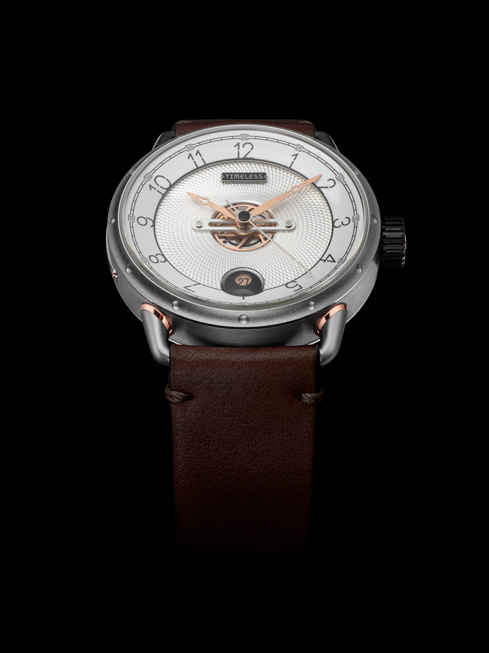 Second modèle de la marque Timeless, ce garde-temps en acier orné de fins détails plaqués en or rose et d’un verre saphir bombé sied à tous.