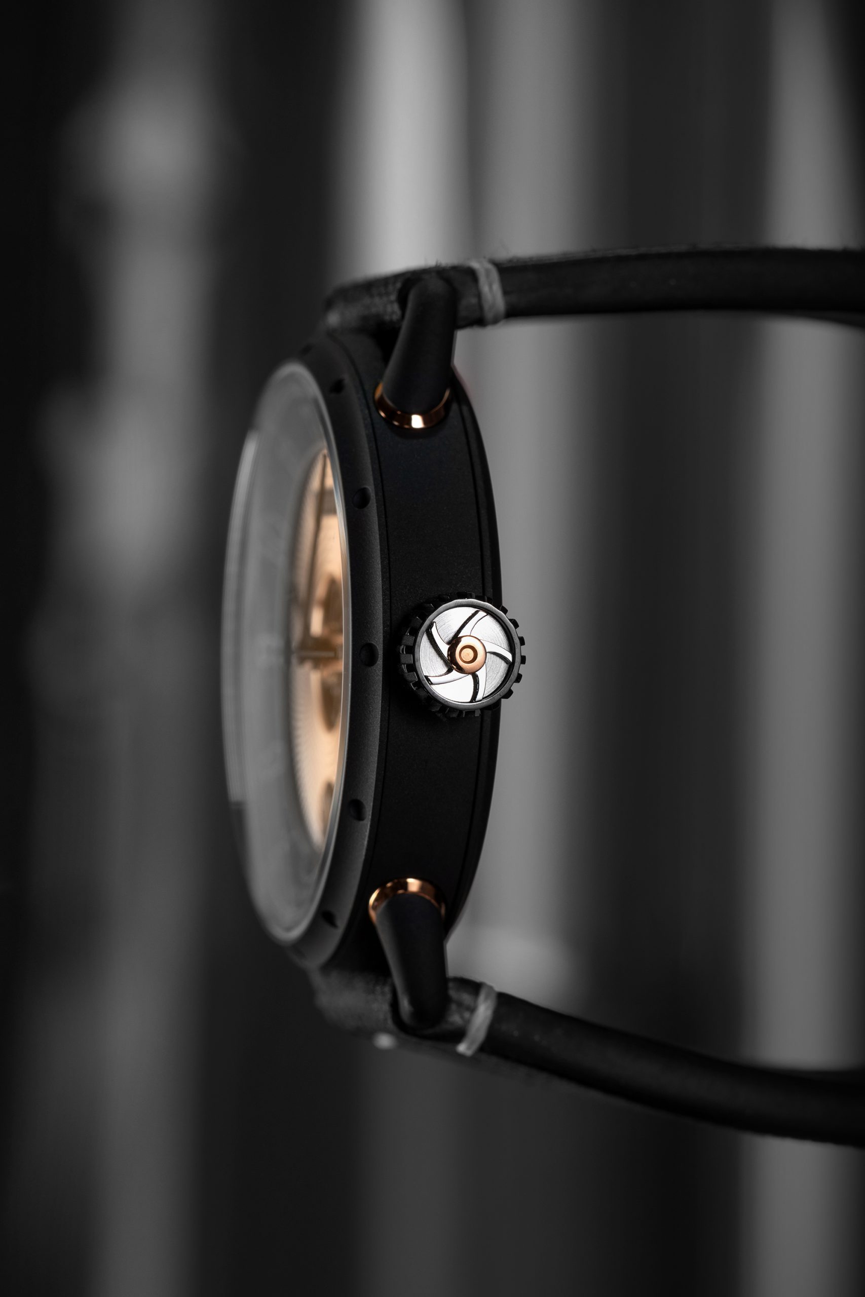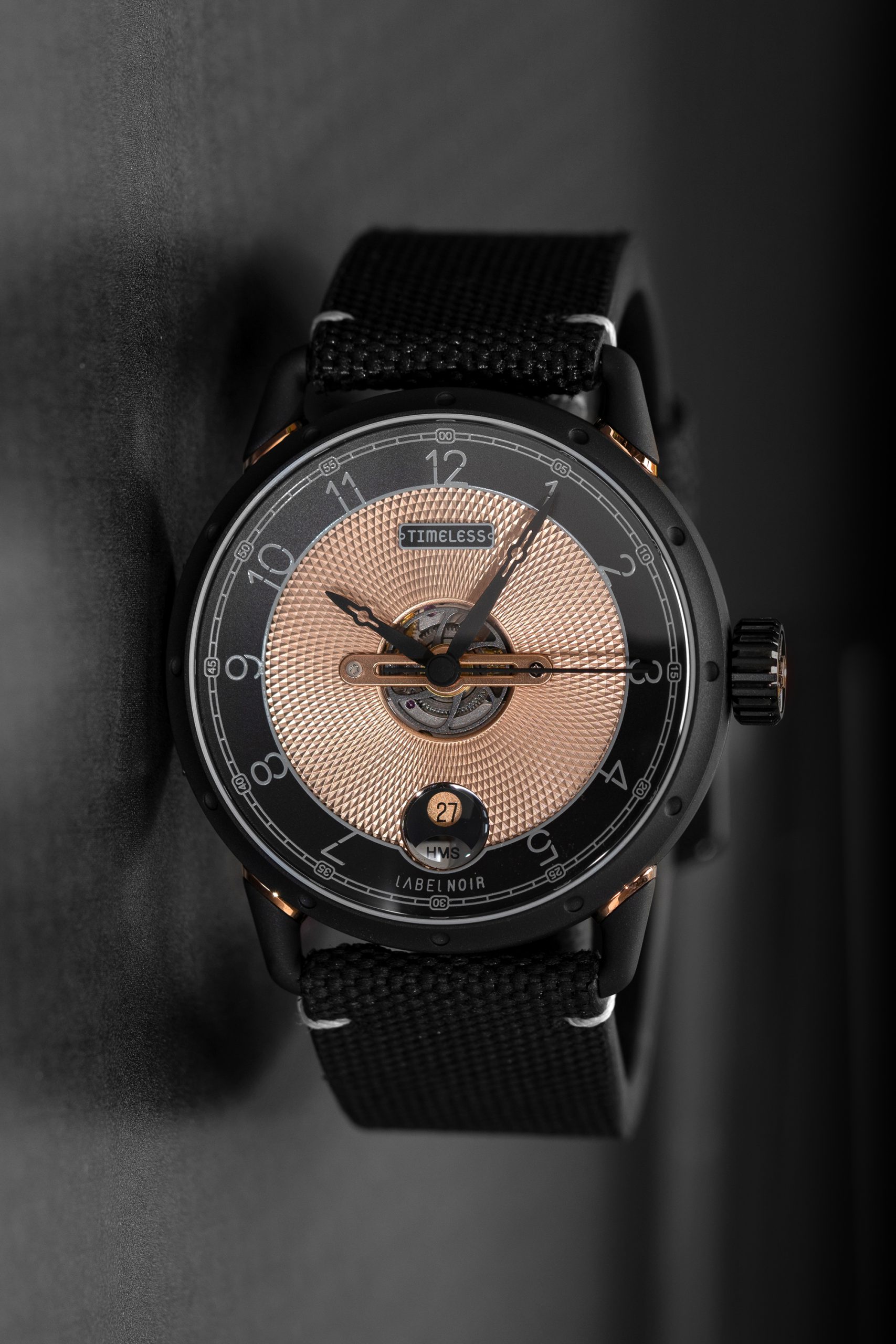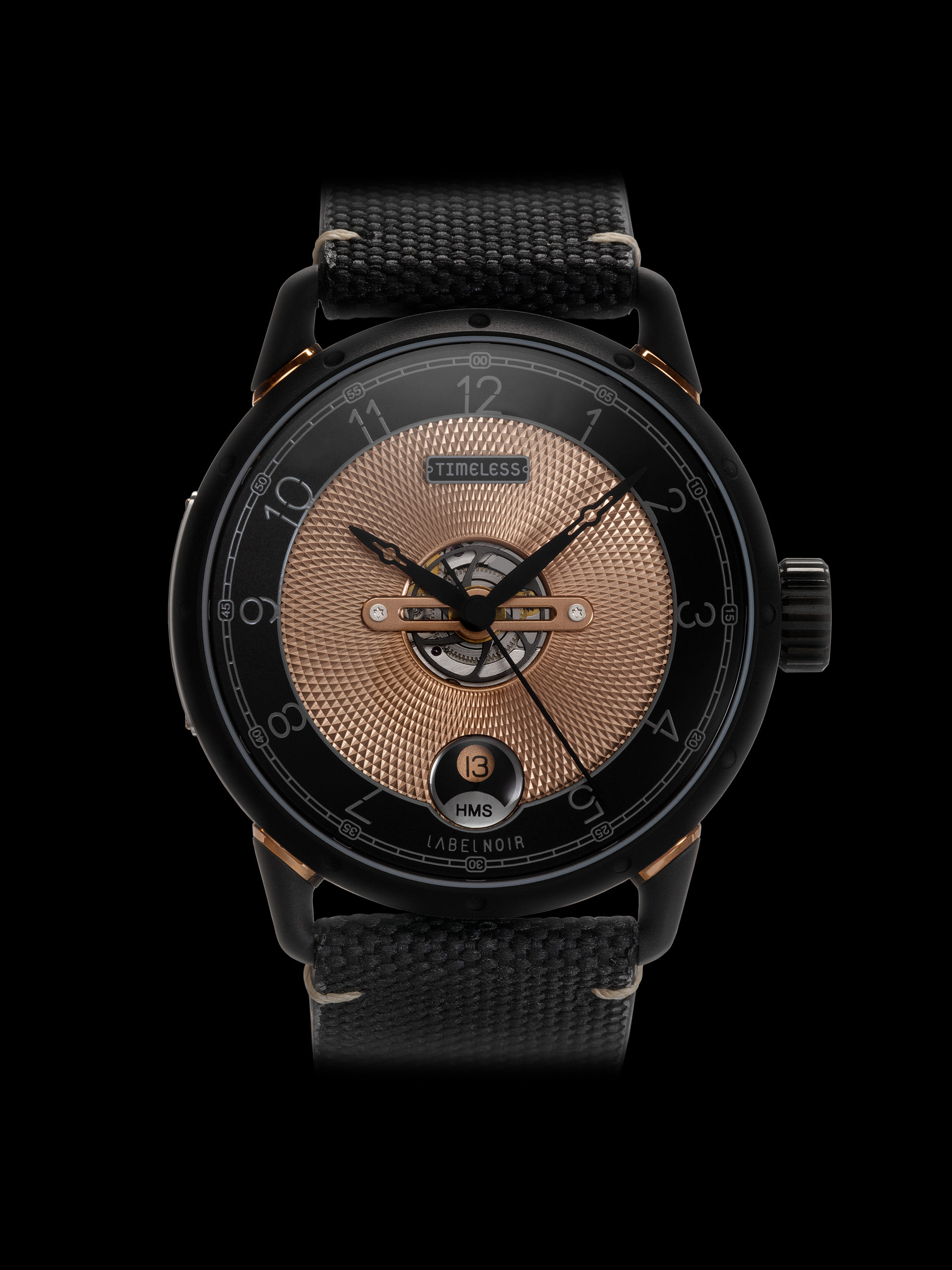 Première collaboration de Timeless avec Label Noir, cette édition exclusive revisite la HMS 003 en noir microbillé mat, avec un nouveau bracelet fait main.
